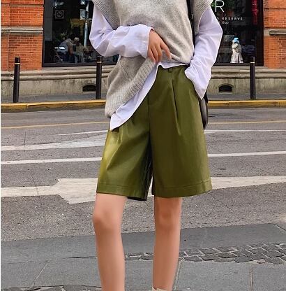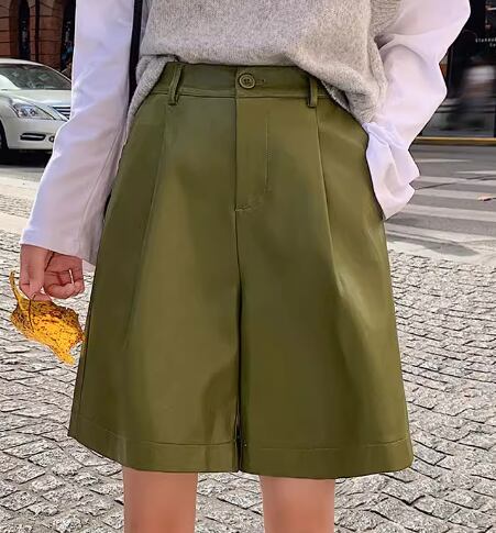 レディース パンツ ハーフパンツ ショートパンツ レザーパンツ ワイド ポケット ハイウエスト レザー PU かわいい 大人可愛い きれいめ シンプル カジュアル 上品 おしゃれ かっこいい レトロ ラフ ボーイッシュ ルーズ クール エレガント ナチュラル ハンサム シック 高級感 無地 春 秋 デート お出かけ 脚長 普段使い 着回し S M L XL 大きいサイズ ブラック カーキ グリーン