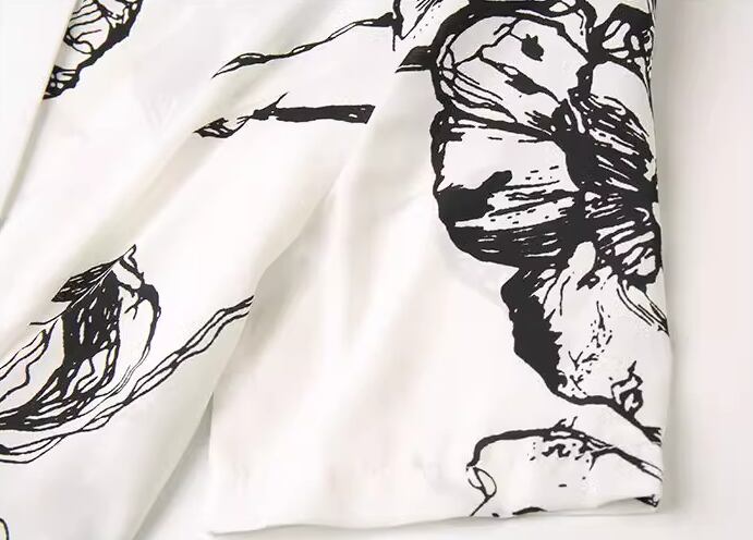 ホワイト×ブラックのシックな色使いとエレガントな花柄模様が魅力的な半袖のミモレ丈ワンピース。