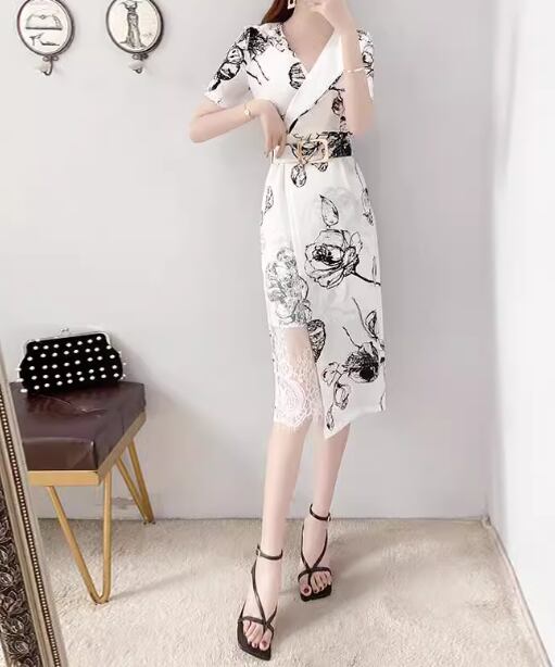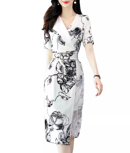 レディース ドレス ワンピース パーティードレス パーティー 膝下 ミモレ 半袖 Vネック タイト スリム 細身 Aライン ウエストマーク ドッキング ファスナー ハイウエスト プルオーバー 可愛い きれいめ 大人可愛い 上品 おしゃれ かっこいい ガーリー クール エレガント シック 高級感 花柄 フラワー プリント イベント ホテル レストラン デート 食事会 会食 高見え 女子会 夏 S M L XL 小さめ ホワイト