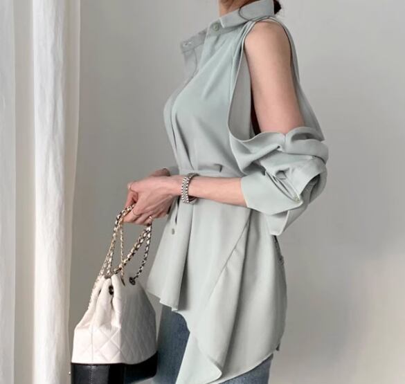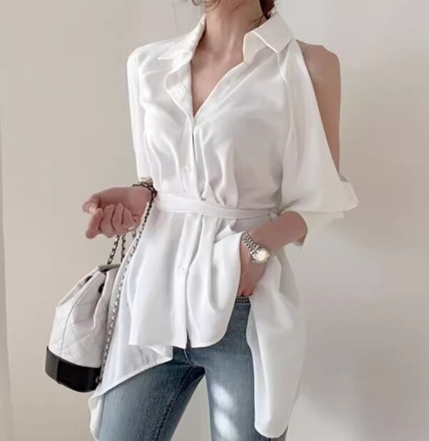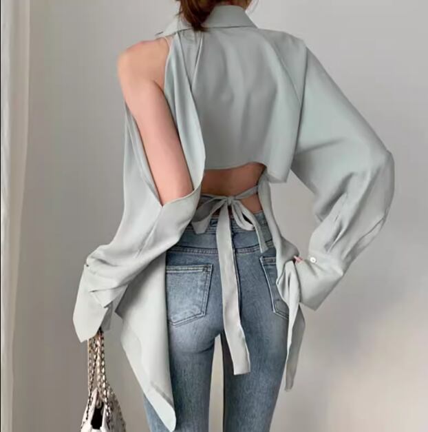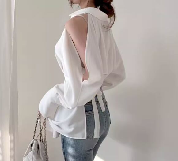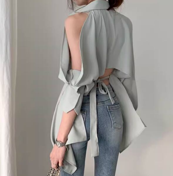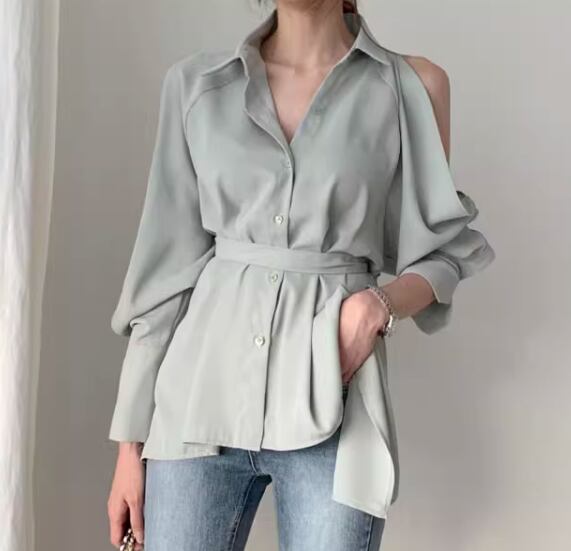 レディース トップス シャツ ミドル丈 長袖 ボリューム袖 ランタンスリーブ 腕出し 肩出し 襟付き ポロカラー 肌見せ 背中開き ウエストマーク バックリボン 前開き 異国風 ボタン 綿 コットン かわいい 大人可愛い きれいめ カジュアル おしゃれ かっこいい こなれ感 ルーズ 個性的 クール エレガント 抜け感 ラグジュアリー セクシー 無地 春 デート お出かけ 韓国 普段使い 着回し ゆったり フリーサイズ ホワイト ブラック グリーン