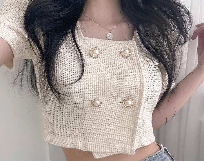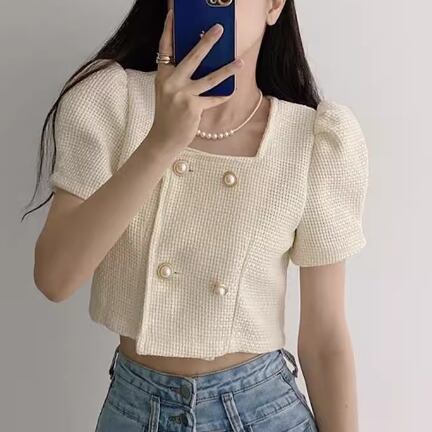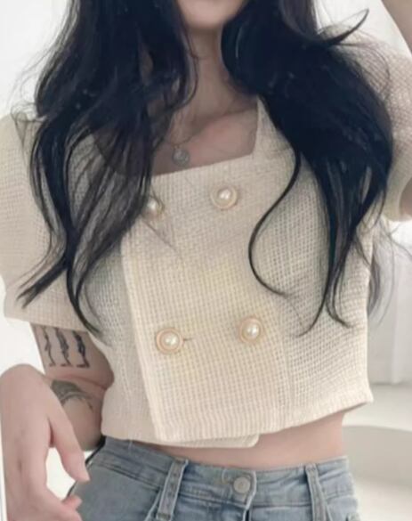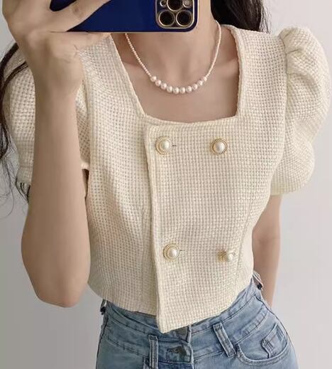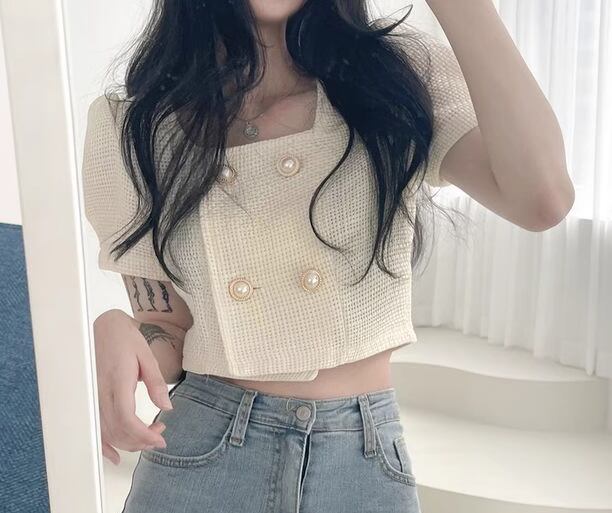 レディース トップス ジャケット カットソー 羽織 前開き ショート クロップド丈 半袖 パフスリーブ スクエアネック ストレート フェミニン 異国風 ボタン ツイード かわいい 大人可愛い きれいめ シンプル カジュアル 上品 おしゃれ かっこいい こなれ感 ラフ エレガント 抜け感 キュート ラグジュアリー 夏 10代 20代 学生 デート お出かけ 韓国 普段使い 着回し フリーサイズ アプリコット