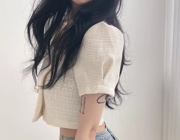 丈が短いのでハイウエストのパンツを合わせるとコーディネートがすっきりと纏まります。