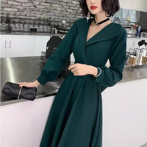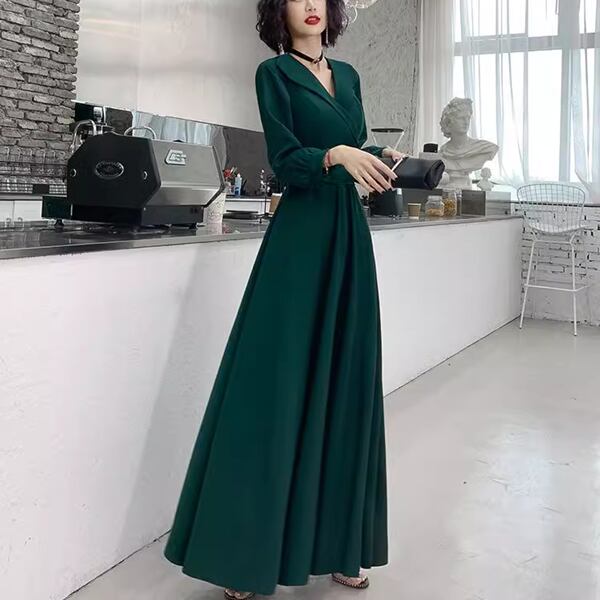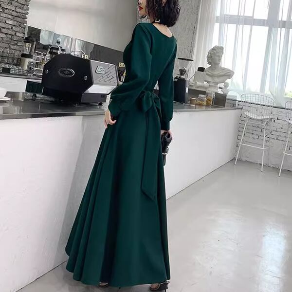 バンケットスタイルハイエンドイブニングドレス レディース ワンピース ドレス フレアスカート ロングスカート マキシ 長袖 パフスリーブ Vネック ビッグカラー 細身 Aライン フォーマル 裾ワイド リボン ウエストマーク バックリボン ハイウエスト 大人可愛い 上品 おしゃれ かっこいい レトロ クール エレガント モダン キュート ラグジュアリー 清潔感 爽やか 高級感 無地 春 秋 冬 20代 30代 40代 パーティー イベント レストラン ホテル ショッピング コンサート 体型カバー 着瘦せ