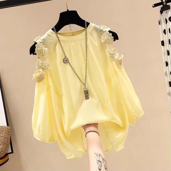 夏にぴったりのオフショルダーシフォンシャツ。半袖で薄手の素材が涼しく、お腹をカバーする丈感で着心地も抜群。華やかな夏花のディテイルで肩がさわやかに飾りつけられる。そんな斬新なデザインで貴女の輝きを演出する都会的で洗練された一着です。