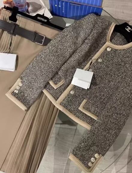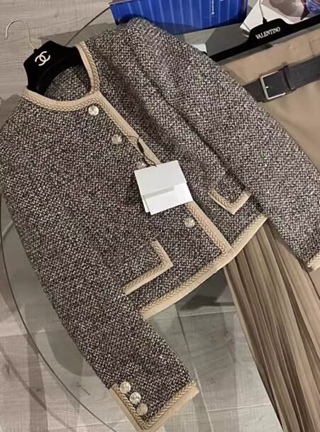 落ち着いたブラウンの色味と高級感のあるエレガントなデザインが魅力的なショート丈のノーカラージャケット。