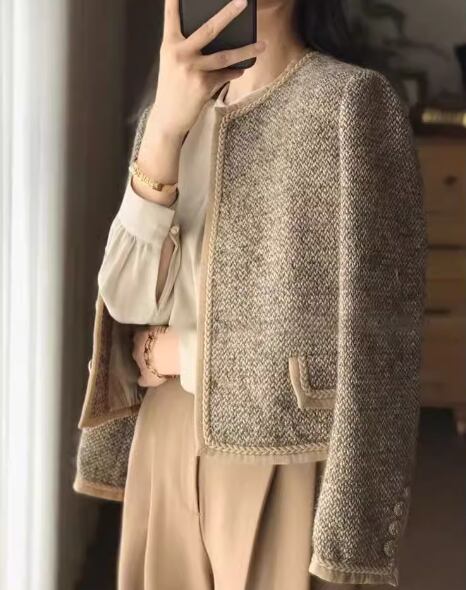 レディース ジャケット コート アウター 上着 ウール ノーカラーコート ノーカラージャケット ショート クロップド丈 長袖 ラウンドネック 襟なし ノーカラー 異国風 ボタン ツイード かわいい 大人可愛い きれいめ シンプル カジュアル 上品 おしゃれ かっこいい レトロ こなれ感 クール エレガント 無地 春 秋 ママ OL デート お出かけ 普段使い 着回し S M L XL 大きいサイズ ブラウン