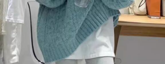 爽やかなブルーグリーンの色味とゆるだぼなオーバーサイズが可愛いケーブルニットの長袖セーター。