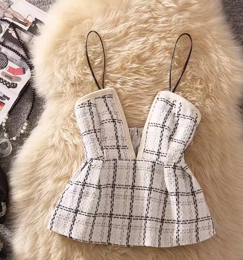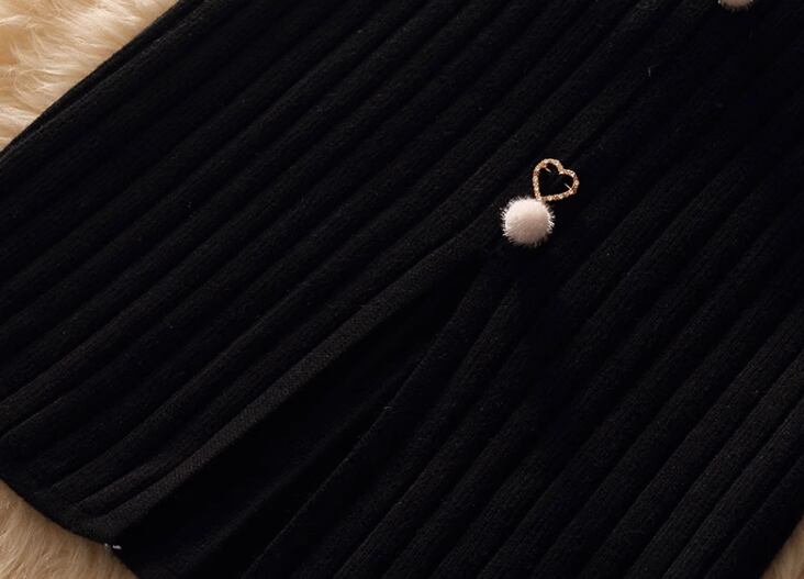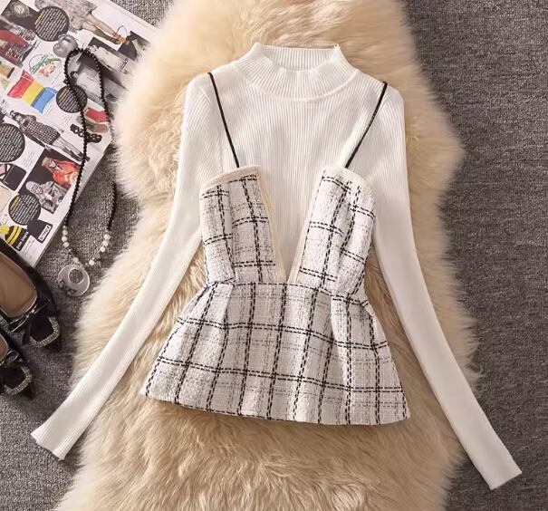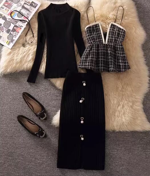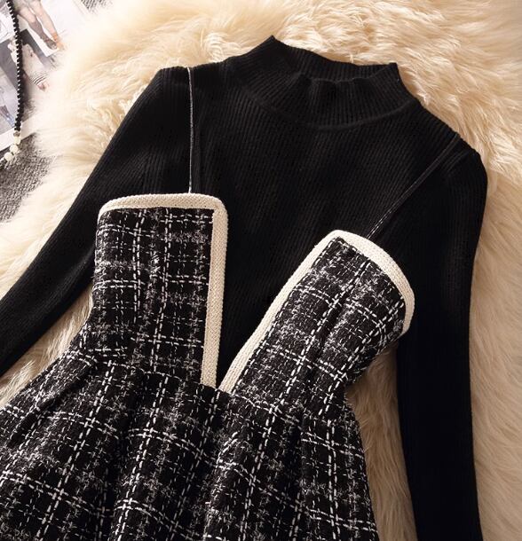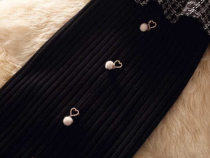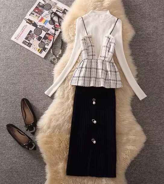 長袖のニットセーターとチェック柄が可愛いビスチェ、ハート×パールが女性らしさを演出してくれるミモレ丈のスカートの三点セットです。