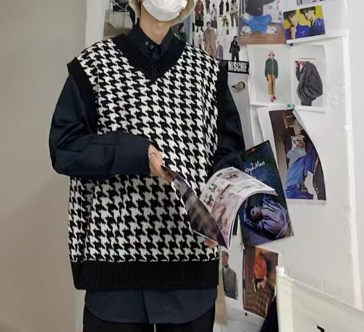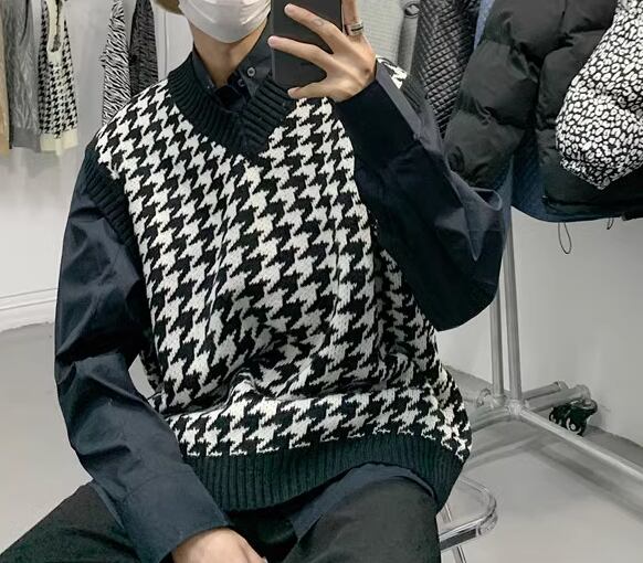メンズ ニット プルオーバー ベスト ウール ミドル丈 袖なし ノースリーブ Vネック かわいい 大人可愛い カジュアル 上品 おしゃれ かっこいい レトロ こなれ感 ルーズ クール エレガント キュート ラグジュアリー シック 高級感 千鳥格子 秋 冬 デート お出かけ 重ね着 体型カバー 普段使い 着回し レイヤード トレンド 流行 M L XL 大きいサイズ ゆったり ゆる 大きめ ホワイト ブラック