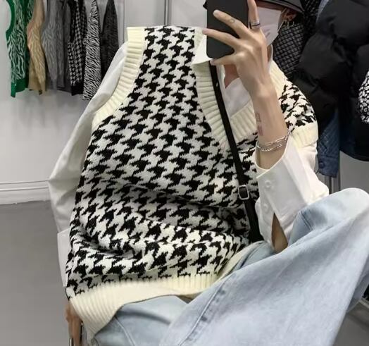 エレガントで大人レトロな千鳥格子柄のノースリーブニットベスト。
