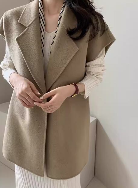 上品で落ち着いた色味とシンプルで洗練されたデザインが大人可愛いノースリーブのミドル丈ジレ。