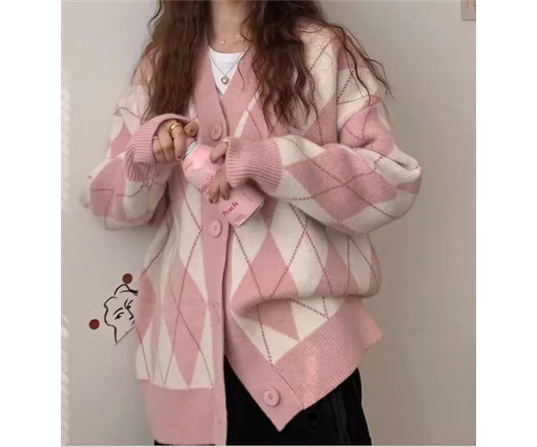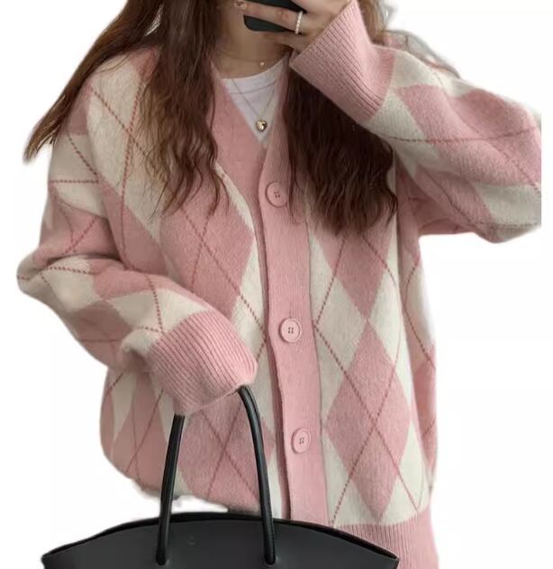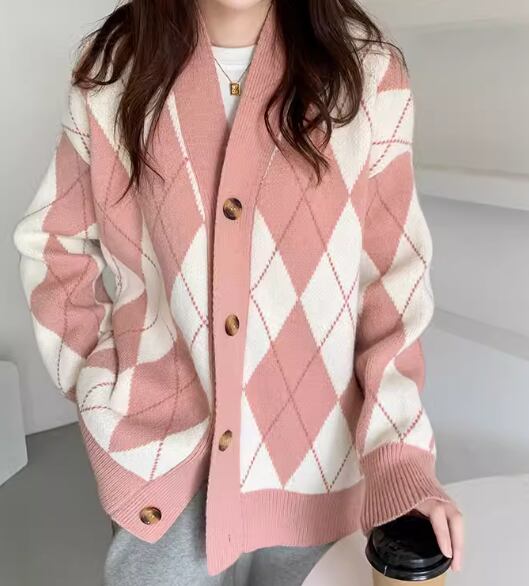 レディース トップス ニット カーディガン 羽織 前開き ミドル丈 長袖 Vネック ストレート フェミニン 異国風 ボタン かわいい 大人可愛い きれいめ カジュアル 上品 おしゃれ かっこいい レトロ ボーイッシュ ガーリー ルーズ ダイヤ アーガイル 菱形 春 秋 デート お出かけ 韓国 体型カバー 普段使い 着回し トレンド 流行 S M L XL 大きいサイズ ゆったり ゆる 大きめ オーバーサイズ ブラック ピンク