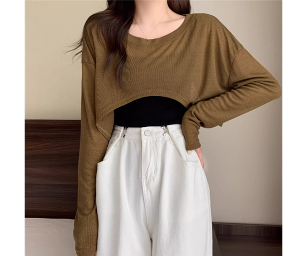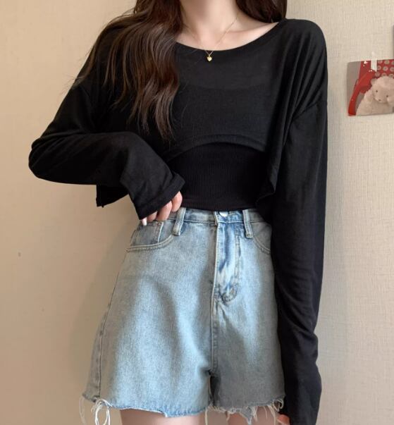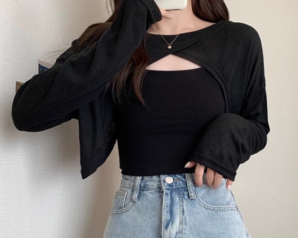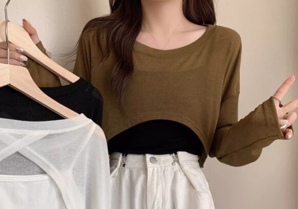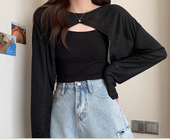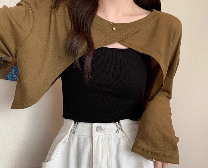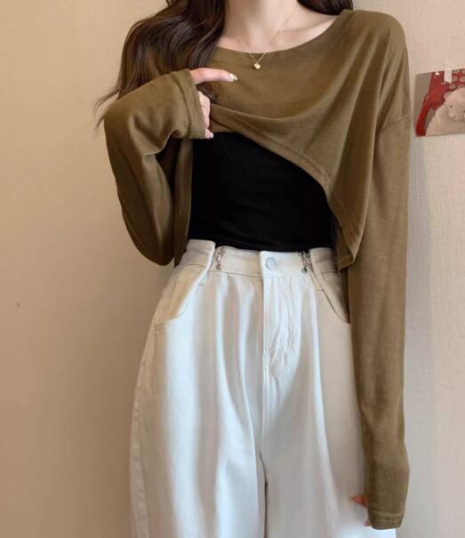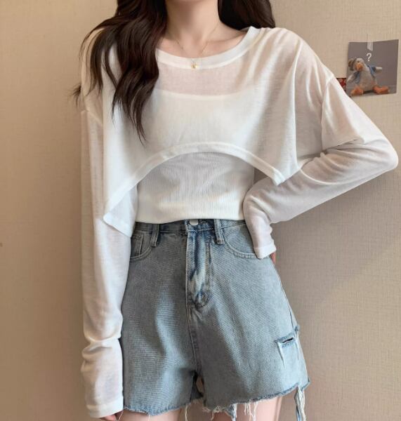 二点セット ツーピース レディース トップス カットソー プルオーバー ショート クロップド丈 長袖 ラウンドネック 2way ストレッチ 伸縮性 かわいい 大人可愛い きれいめ シンプル カジュアル おしゃれ かっこいい こなれ感 クール 無地 夏 10代 20代 学生 デート お出かけ 重ね着 普段使い 着回し レイヤード トレンド 流行 日焼け防止 日焼け対策 フリーサイズ ホワイト ブラック カーキ