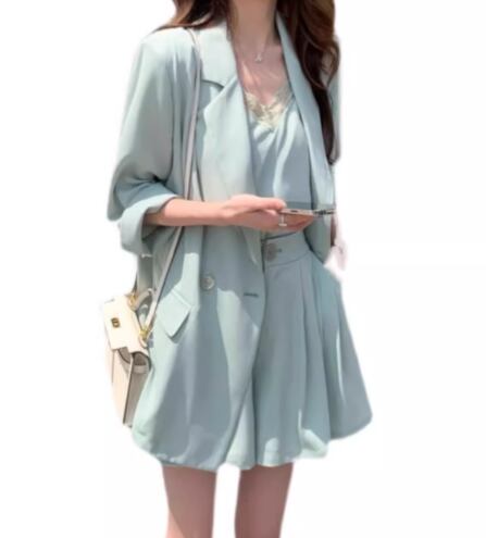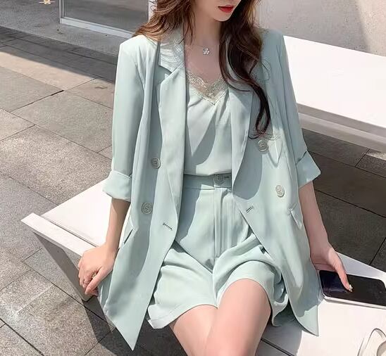 上下セット 三点セット スリーピース レディース ジャケット パンツ キャミソール スーツ セットアップ インナー ショートパンツ 5分袖 7分袖 襟付き スーツカラー フェミニン ボタン 薄手 かわいい 大人可愛い きれいめ シンプル カジュアル 上品 おしゃれ かっこいい こなれ感 ラフ 無地 夏 10代 20代 学生 デート お出かけ 重ね着 普段使い 着回し レイヤード S M L ピンク ブルー パステル くすみ アプリコット グリーン
