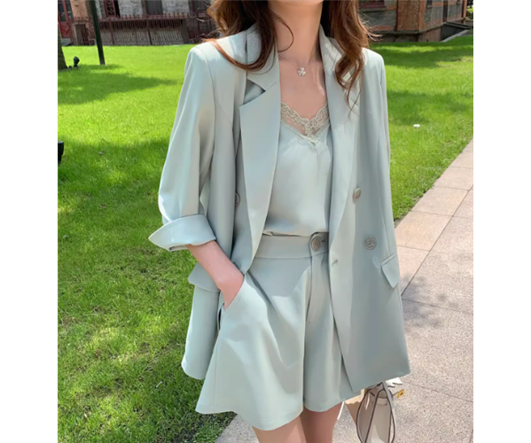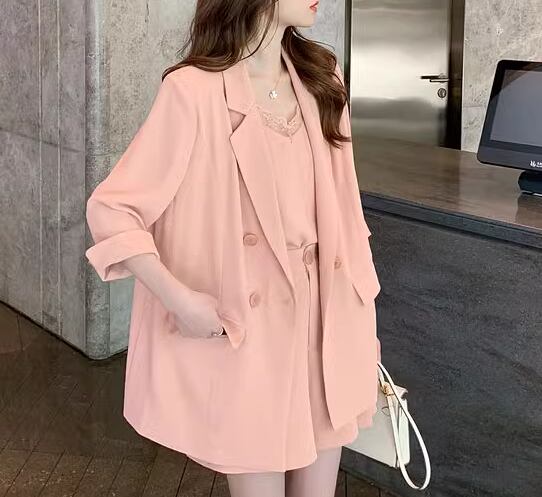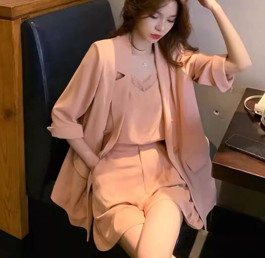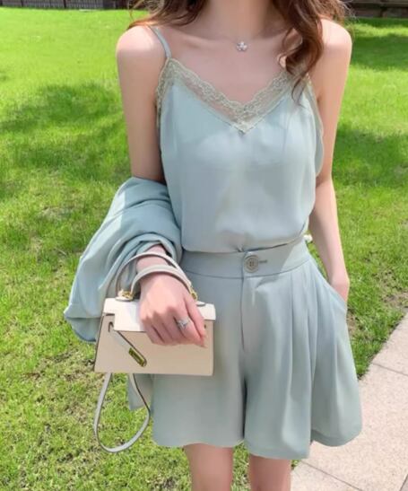 七分袖のゆったりジャケットとレースが可愛いキャミソールインナー、ワイドシルエットなショートパンツの三点セットです。