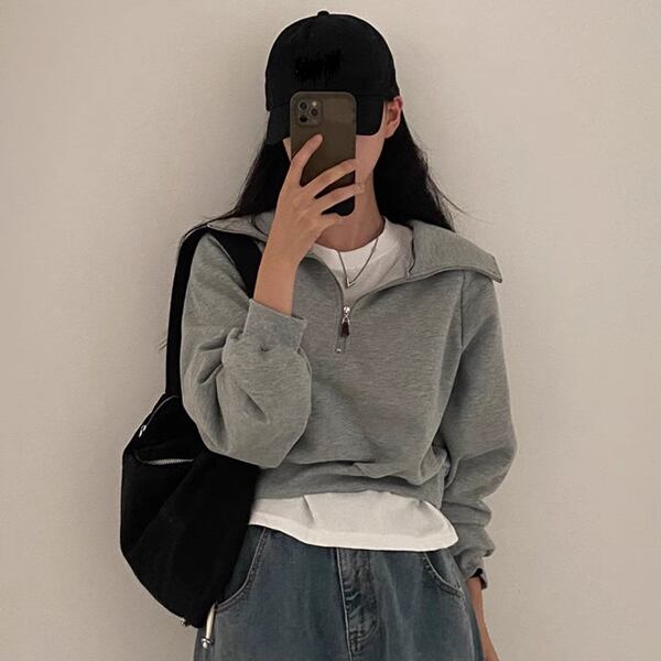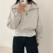 アメカジスタイルラペルのハーフジップ長袖パーカー。スウェットシャツ素材で快適な着心地を提供しつつ、スタイリッシュなデザインが特徴のレディーストレーナーです。