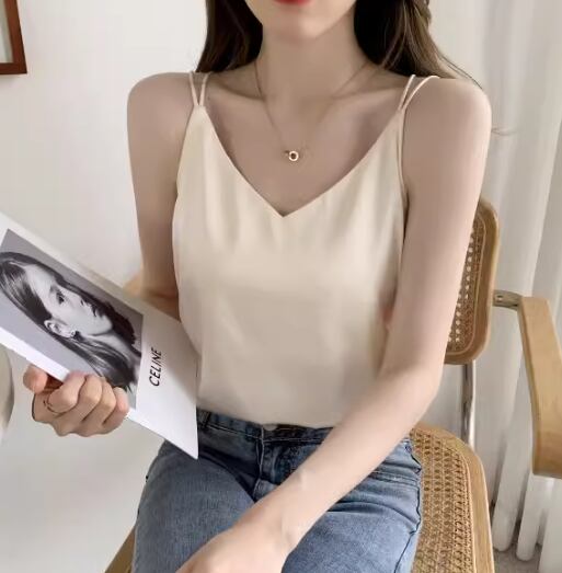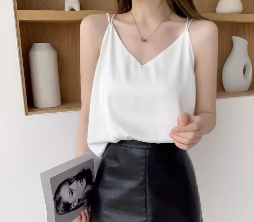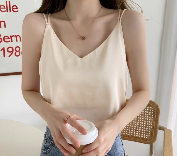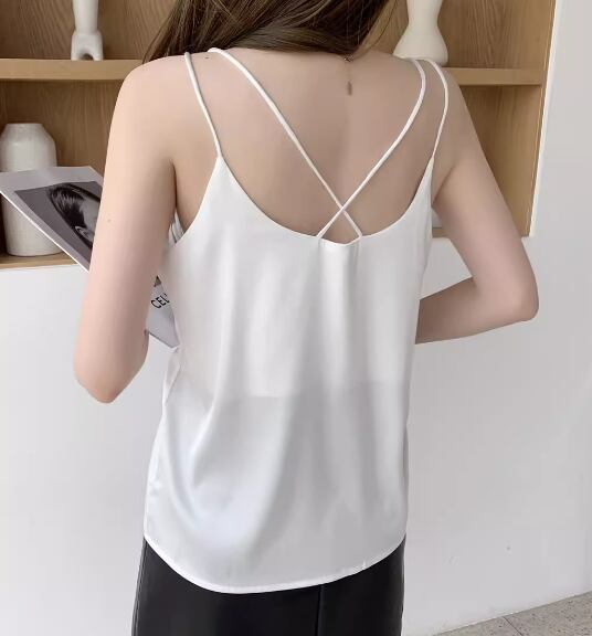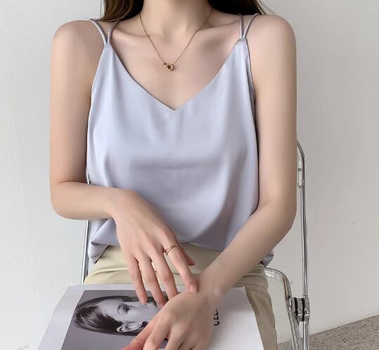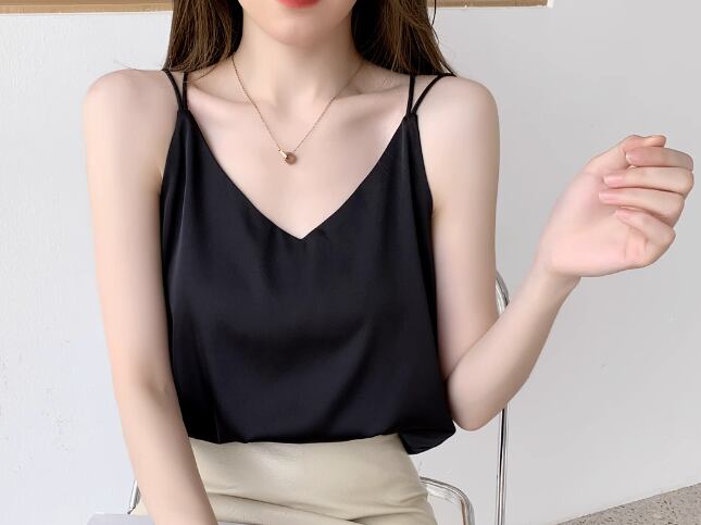 レディース トップス プルオーバー キャミソール インナー ミドル丈 袖なし ノースリーブ Vネック ストレート 背中開き フェミニン サテン ストレッチ 伸縮性 かわいい 大人可愛い きれいめ シンプル カジュアル 上品 おしゃれ かっこいい ラフ クール エレガント キュート シック 高級感 無地 夏 デート お出かけ 普段使い 着回し S M L XL ホワイト ブラック グレー アプリコット
