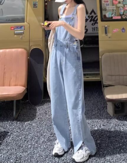 レディース パンツ オーバーオール フルレングス 袖なし ノースリーブ スクエアネック ウエストマーク スリット ファスナー ポケット ハイウエスト ウォッシュ デニム ブルーデニム かわいい 大人可愛い シンプル カジュアル おしゃれ かっこいい レトロ メンズライク ボーイッシュ クール アクティブ 無地 夏 デート お出かけ 重ね着 体型カバー 美脚 脚長 普段使い 着回し レイヤード S M L ライトブルー