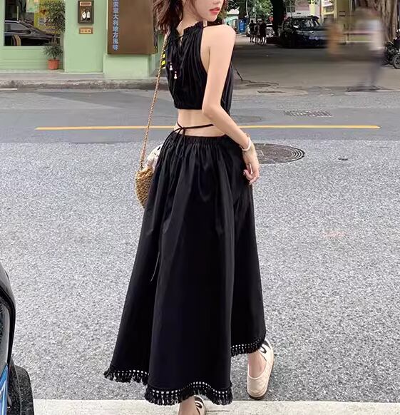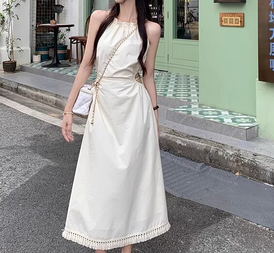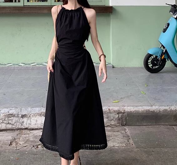レディース ワンピース ミモレ ロング 袖なし ノースリーブ ホルターネック 背中開き フェミニン ウエストマーク バックリボン フリンジ かわいい 大人可愛い きれいめ シンプル カジュアル 上品 おしゃれ かっこいい こなれ感 ガーリー 個性的 クール エレガント 抜け感 キュート ラグジュアリー 無地 夏 10代 20代 学生 デート お出かけ 普段使い トレンド 流行 S M L ブラック アプリコット