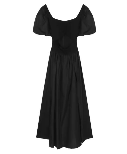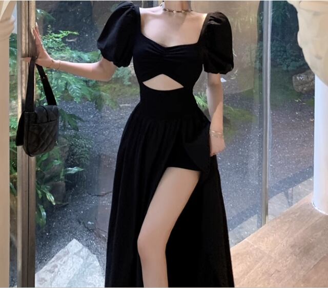 レディース ドレス ロング マキシ イレギュラー アシンメトリー 左右非対称 半袖 パフスリーブ スクエアネック スリム 細身 ウエストマーク スリット プルオーバー 可愛い きれいめ シンプル カジュアル 大人可愛い おしゃれ かっこいい クール エレガント 抜け感 セクシー シック ラグジュアリー 無地 パーティー イベント ホテル レストラン デート 食事会 会食 高見え 夏 S M L 小さめ ブラック