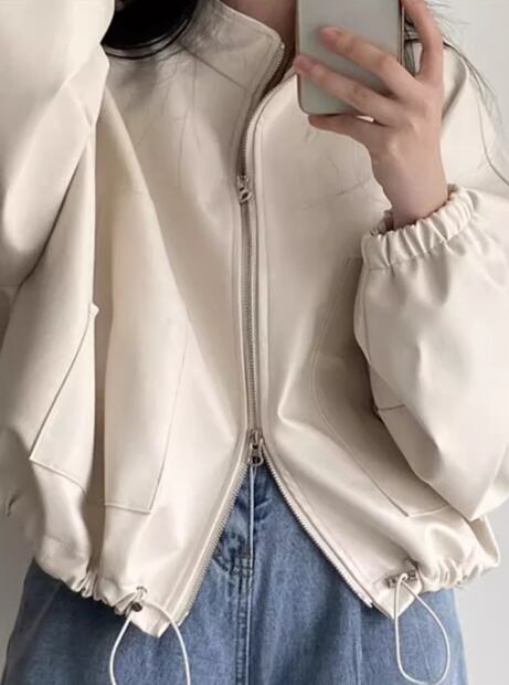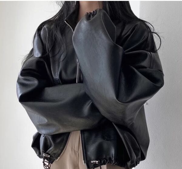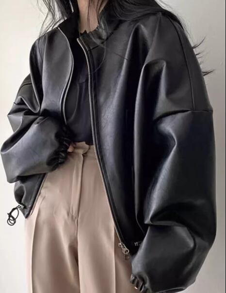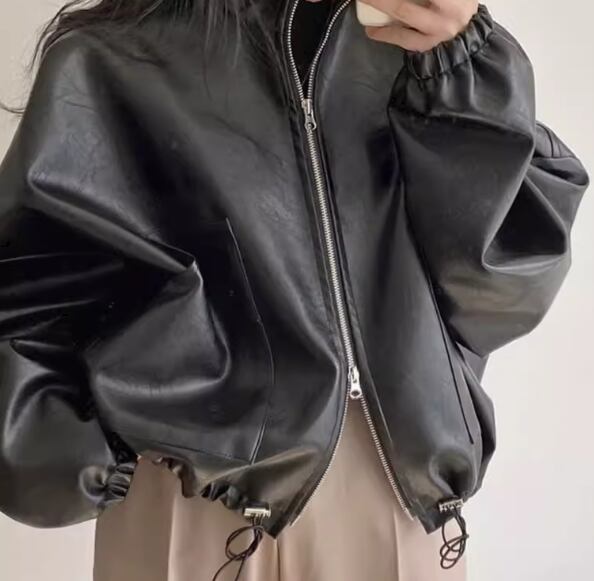 レディース ジャケット アウター 上着 レザージャケット ライダースジャケット ショート クロップド丈 長袖 スタンドカラー ファスナー ポケット 前開き 異国風 シンプル カジュアル おしゃれ かっこいい レトロ こなれ感 メンズライク ボーイッシュ ルーズ クール 無地 秋 デート お出かけ 韓国 体型カバー 普段使い 着回し トレンド 流行 ゆったり ゆる フリーサイズ 大きめ オーバーサイズ ブラック オフホワイト