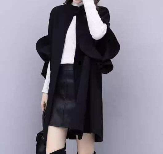 上品で落ち着いた色味とシンプルで洗練されたデザインが大人っぽいケープコート。