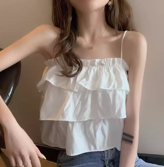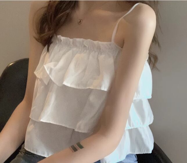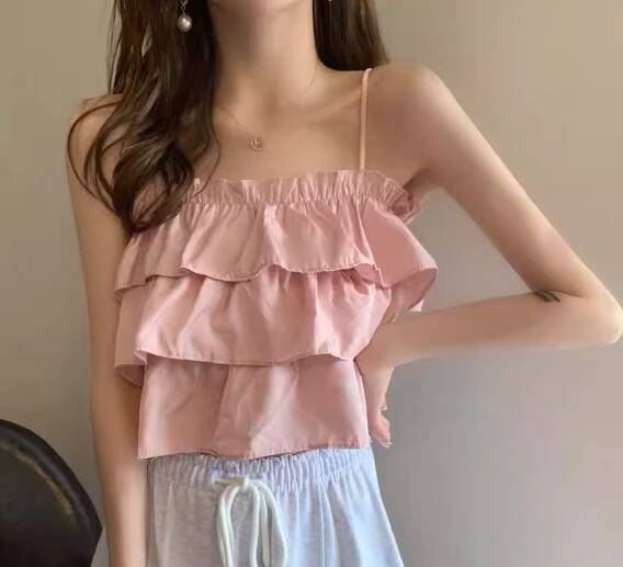 たっぷりのフリルがガーリーで可愛いクロップド丈のキャミソール。
