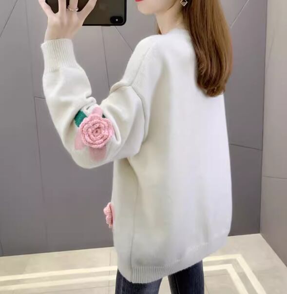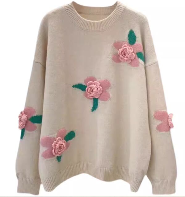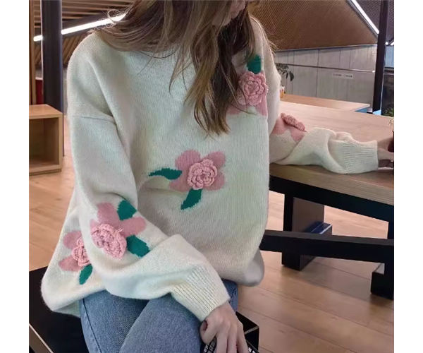 ピンク色のお花の立体装飾がおしゃれな長袖のニットセーター。