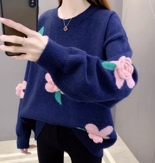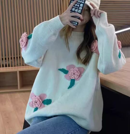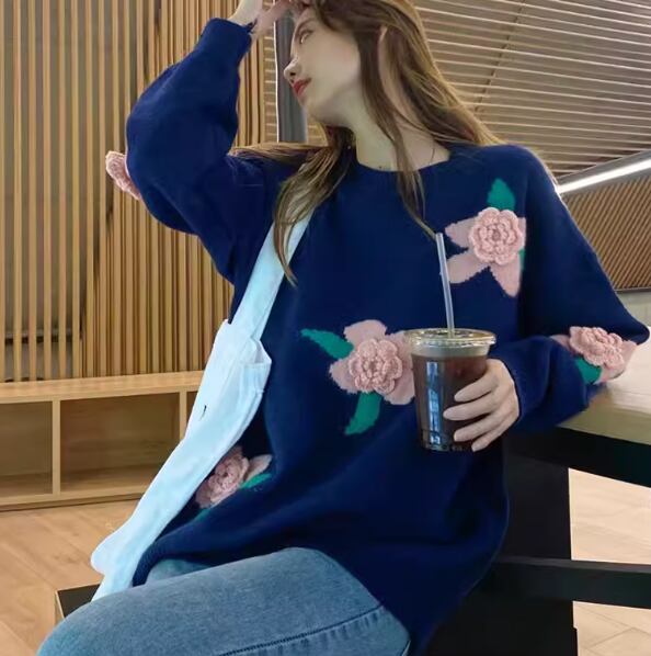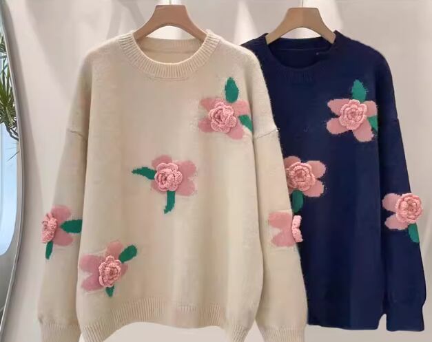 レディース トップス ニット セーター プルオーバー ミドル丈 長袖 ドロップショルダー ラウンドネック ストレート フェミニン 刺繍 立体装飾 かわいい 大人可愛い きれいめ カジュアル 上品 おしゃれ レトロ ガーリー ルーズ 個性的 エレガント 花柄 フラワー 秋 冬 デート お出かけ 体型カバー 普段使い 着回し トレンド 流行 ゆったり ゆる フリーサイズ 大きめ オーバーサイズ ホワイト ネイビー