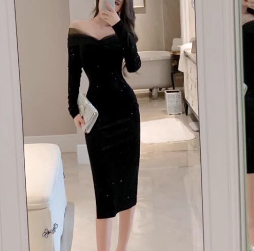 レディース ドレス パーティードレス パーティー 膝下 ミモレ 長袖 オフショル タイト スリム 細身 スリット きれいめ シンプル 大人可愛い 上品 おしゃれ かっこいい クール エレガント 抜け感 セクシー シック 華やか ラグジュアリー 高級感 セレブリティ 女性らしい こなれ感 異国風 無地 イベント レストラン デート 食事会 会食 高見え 秋 S M L XL 小さめ フィット ブラック