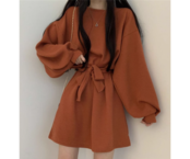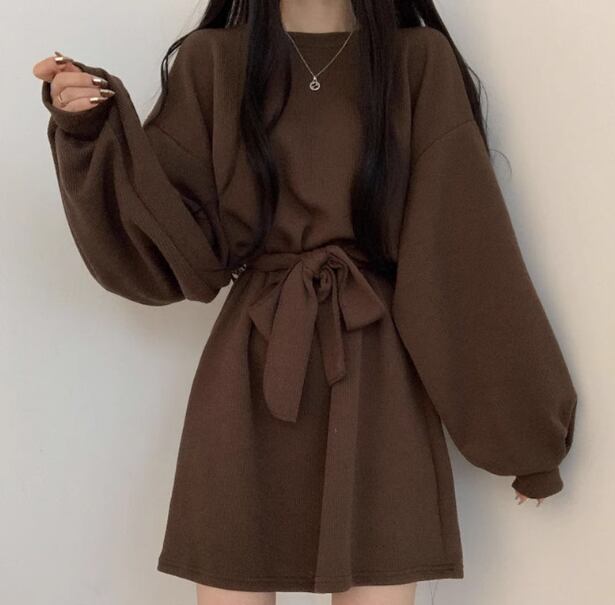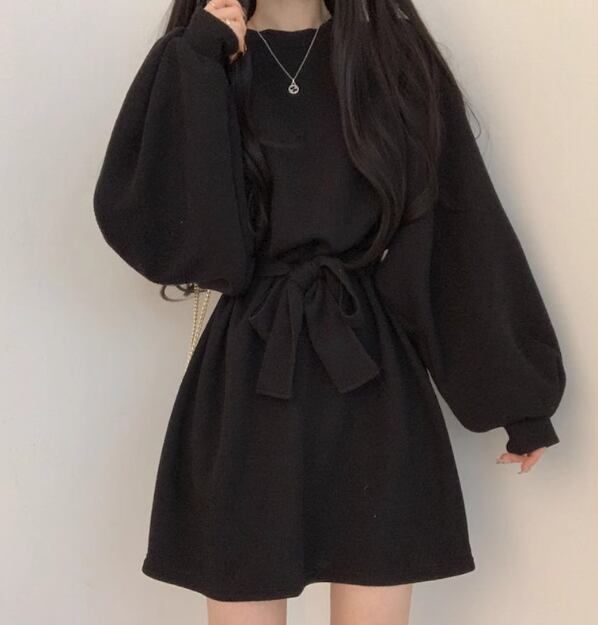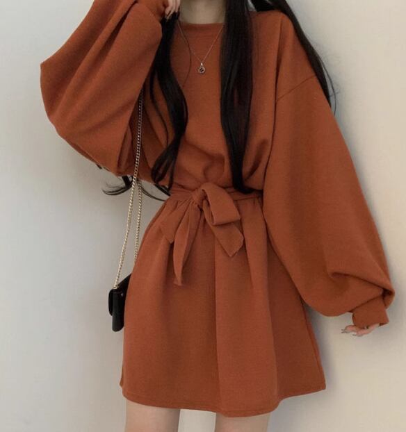 レディース ワンピース プルオーバー ミニ ショート 長袖 パフスリーブ ラウンドネック Aライン フェミニン ウエストマーク ウエストリボン ハイウエスト かわいい 大人可愛い シンプル カジュアル 上品 おしゃれ レトロ ガーリー キュート カレッジ風 学生風 ナチュラル 無地 秋 冬 10代 20代 学生 デート お出かけ 普段使い 清楚 S M L XL 大きいサイズ ブラック ブラウン オレンジ