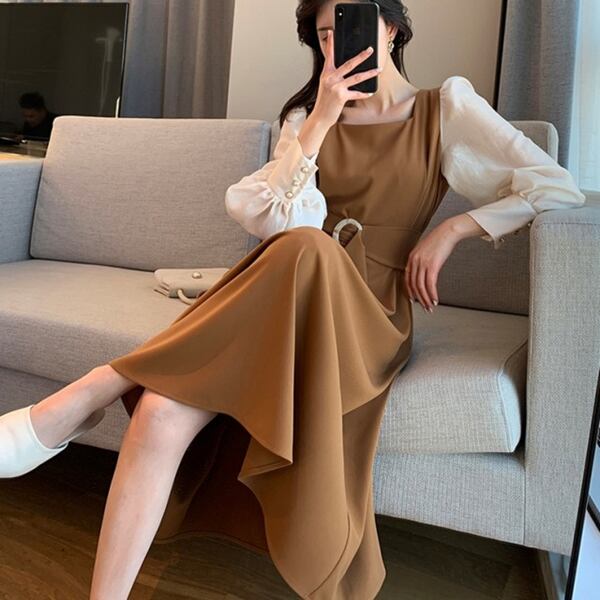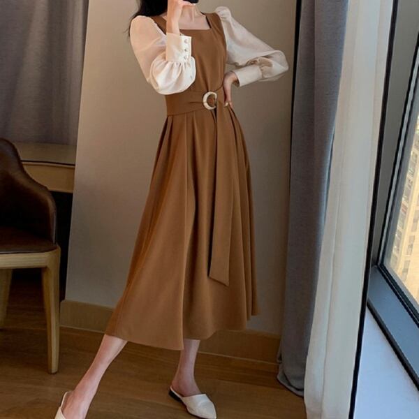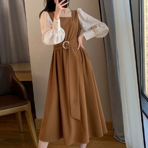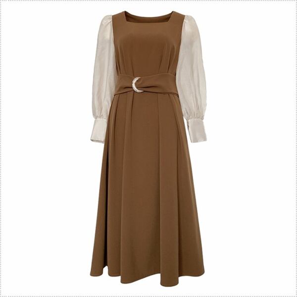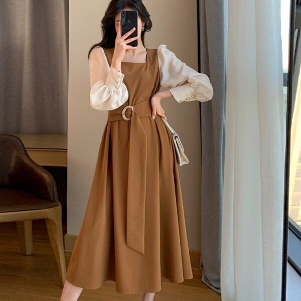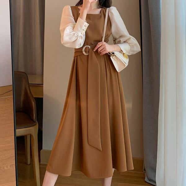 フェイクレイヤードスクエアネックドレス レディース ワンピース ドレス フレアスカート ロングスカート ロング 長袖 パフスリーブ スクエアネック Aライン ベルト バイカラー 大人可愛い きれいめ カジュアル 上品 おしゃれ エレガント モダン 清潔感 爽やか オフィスカジュアル 無地 春 秋 10代 20代 30代 オフィス 通勤 パーティー イベント レストラン ホテル ショッピング コンサート カフェ フェス