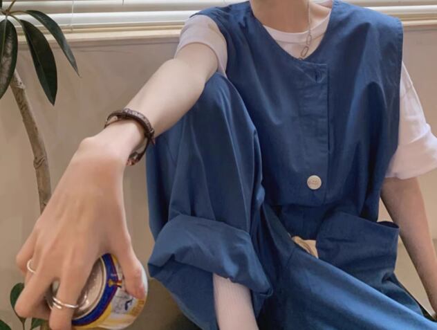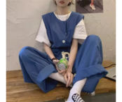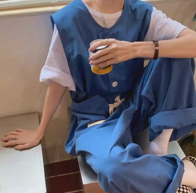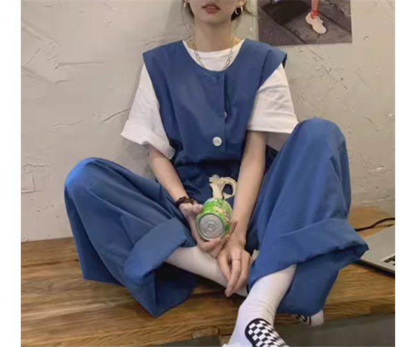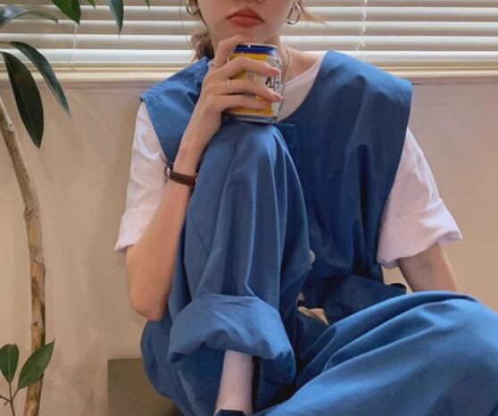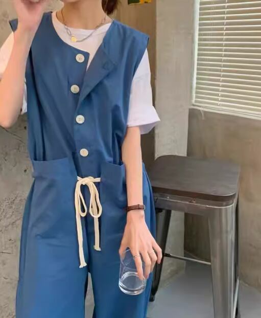 レディース パンツ オーバーオール フルレングス 袖なし ノースリーブ Vネック ワイド ストレート フェミニン ウエストマーク ウエストリボン ボタン かわいい シンプル カジュアル おしゃれ かっこいい レトロ ボーイッシュ ルーズ クール キュート カレッジ風 学生風 ナチュラル 無地 夏 デート お出かけ 重ね着 体型カバー 普段使い 着回し レイヤード S M L XL 大きいサイズ ゆったり ブルー