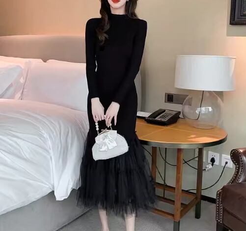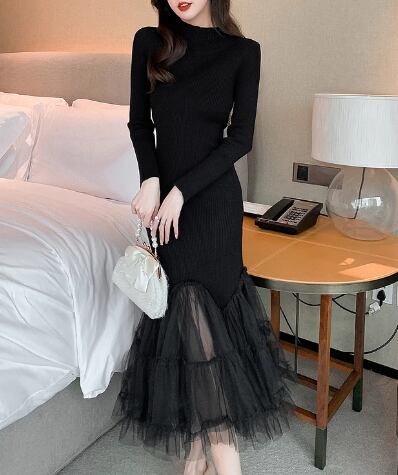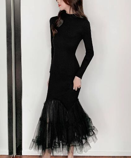 レディース ドレス ワンピース パーティードレス ウェディング パーティー 結婚式 二次会 披露宴 膝下 ミモレ ロング 長袖 タイト スリム 細身 フィッシュテール ドッキング プルオーバー ニット 厚手 メッシュ 可愛い きれいめ シンプル カジュアル 大人可愛い 上品 おしゃれ キュート ガーリー エレガント 無地 イベント ホテル レストラン デート 食事会 会食 クリスマス 高見え 秋 冬 S M L XL 小さめ ブラック