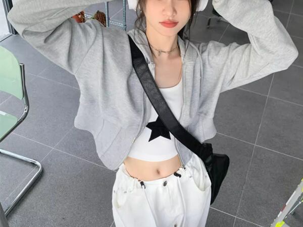 モダンでスポーティなスタイルを演出してくれるアウトフィット。ハイウエストのフード付きスウェット。ショート丈なので、ハイウエストボトムスとの相性がよく、脚長効果もも抜群です。シンプルなデザインながらも、フード付きで一押しのアイテム。ちょっとしたお出かけにも重宝します。スリムなシルエットで、体のラインをきれいに見せてくれる一枚。