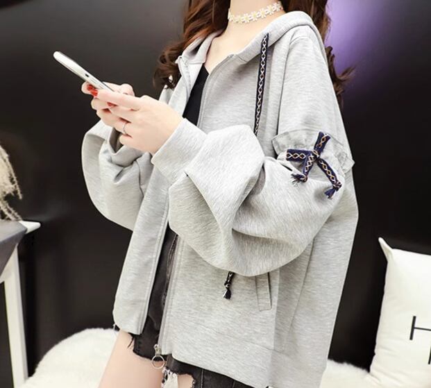 袖の部分についたリボンが可愛い長袖のミドル丈ジップアップパーカー。