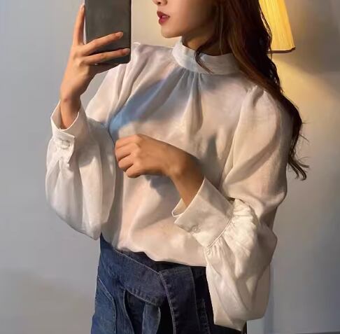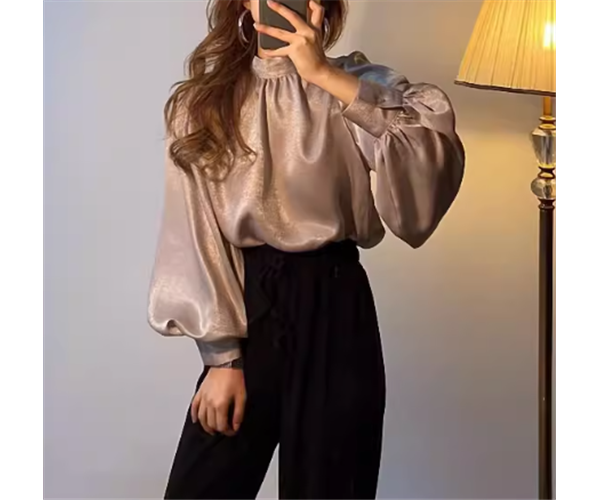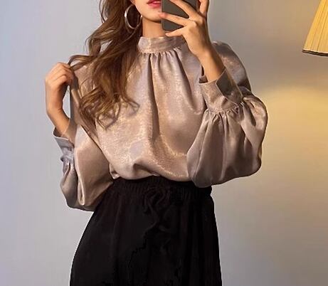 レディース トップス シャツ プルオーバー ミドル丈 長袖 ボリューム袖 バルーン袖 ランタンスリーブ スタンドカラー フェミニン サテン かわいい 大人可愛い きれいめ シンプル 上品 おしゃれ こなれ感 ルーズ クール エレガント ラグジュアリー 豪華 シック 高級感 無地 春 デート お出かけ 体型カバー 普段使い 着回し S M L XL 大きいサイズ ゆったり ホワイト ブラック ブラウン 光沢