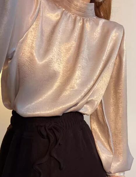 光沢のあるサテン生地がエレガントで上品な長袖シャツ。