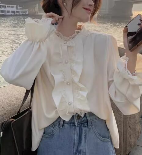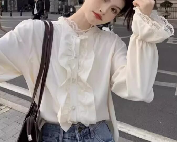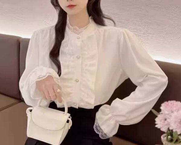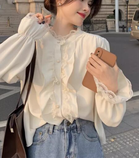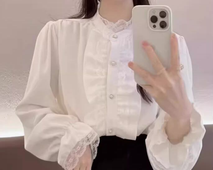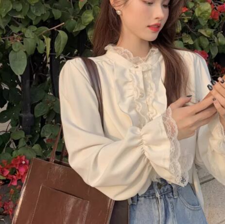 レディース トップス シャツ ブラウス ミドル丈 長袖 フリル袖 ベルスリーブ スタンドカラー フェミニン レース フリル 前開き 異国風 ボタン かわいい 大人可愛い きれいめ 上品 おしゃれ レトロ ガーリー ルーズ エレガント ラブリー キュート ラグジュアリー 無地 春 秋 デート お出かけ 体型カバー 普段使い 着回し 清楚 S M L XL 大きいサイズ ゆったり ホワイト アプリコット