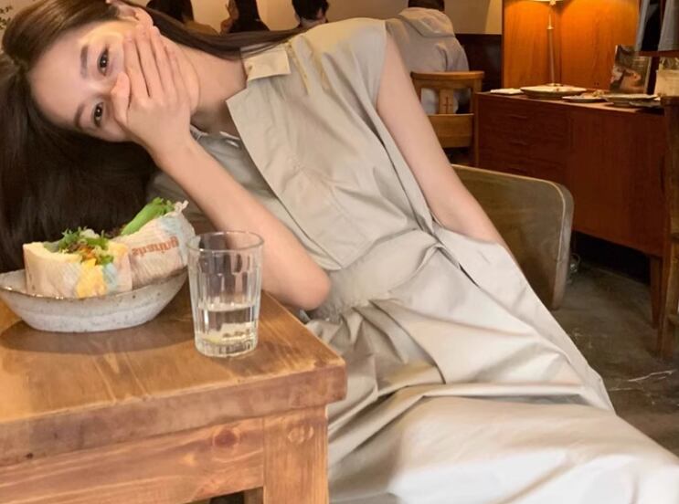 シンプルで洗練されたデザインが大人っぽいミモレ丈のノースリーブワンピース。