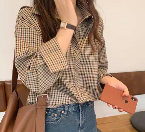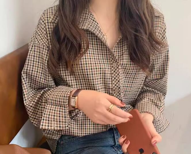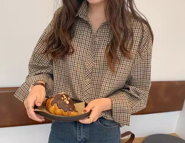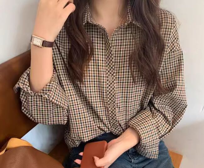 レディース トップス シャツ ミドル丈 長袖 襟付き ポロカラー フェミニン 前開き 異国風 ボタン かわいい 大人可愛い きれいめ シンプル カジュアル 上品 おしゃれ かっこいい レトロ ボーイッシュ ルーズ クール エレガント チェック 春 秋 冬 デート お出かけ 韓国 体型カバー 普段使い 着回し トレンド 流行 S M L XL 大きいサイズ ゆったり ゆる 大きめ オーバーサイズ ブラウン