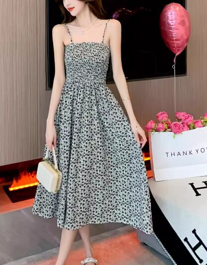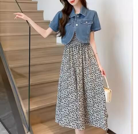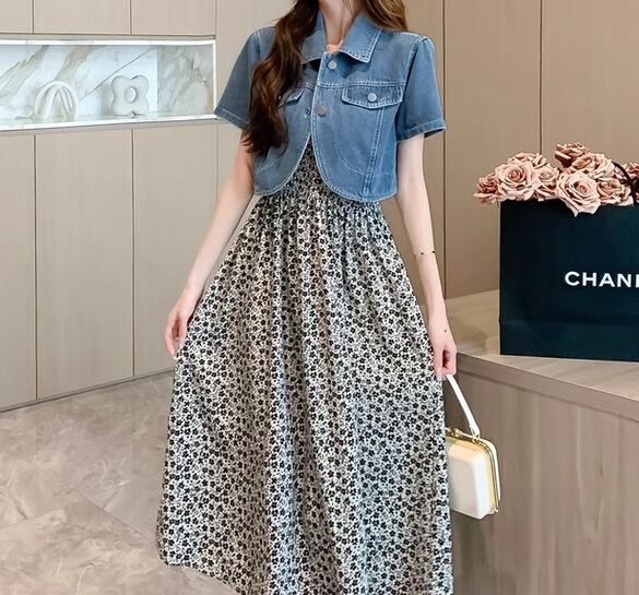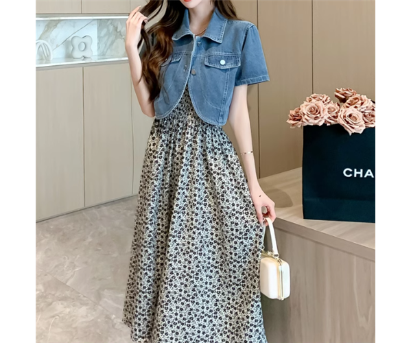 ホワイト×ブラックのシックな色使いと大人可愛い小花柄が魅力的なミモレ丈のキャミワンピースとシンプルで着回し力抜群の半袖デニムジャケットの二点セット。