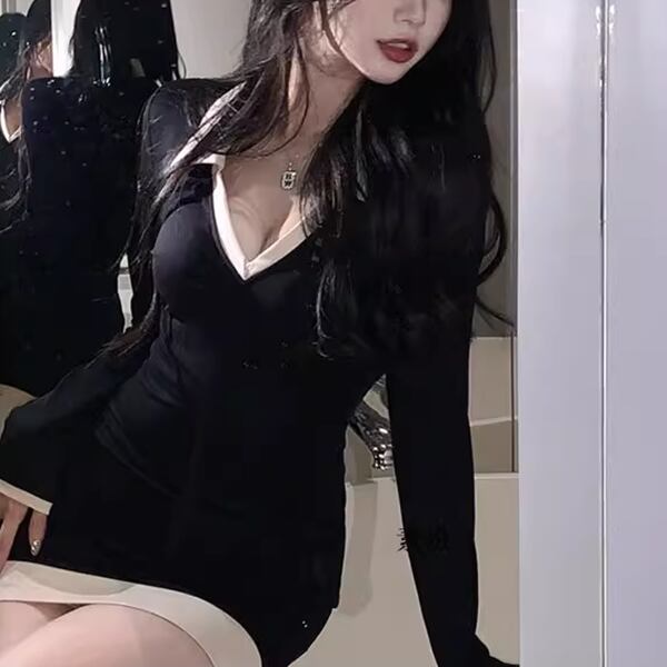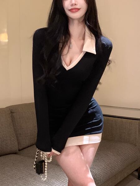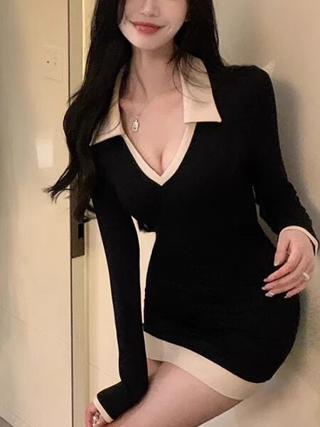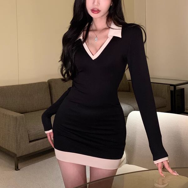 レディース Vネック ポロカラー タイト スリム 細身 フェミニン ハイウエスト ヒップスカート 伸縮性 バイカラー ステッチ きれいめ 上品 おしゃれ かっこいい ガーリー クール エレガント フォーマル キュート セクシー 無地 20代 30代 お出かけ パーティー イベント レストラン コンサート フェス 着回し インスタ映え スタイルアップ フィット ブラックドレス ワンピース イブニングドレス パーティードレス ナイトドレス ニットドレス ニットワンピース パーティー フォーマル ミニ 長袖