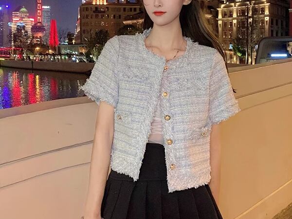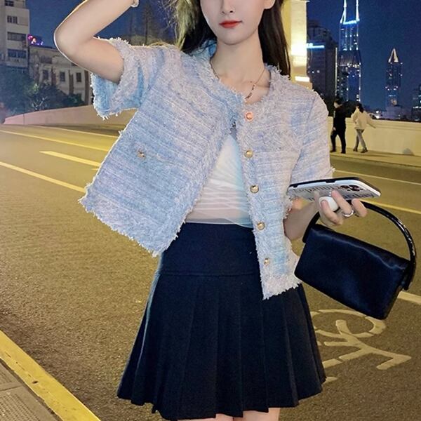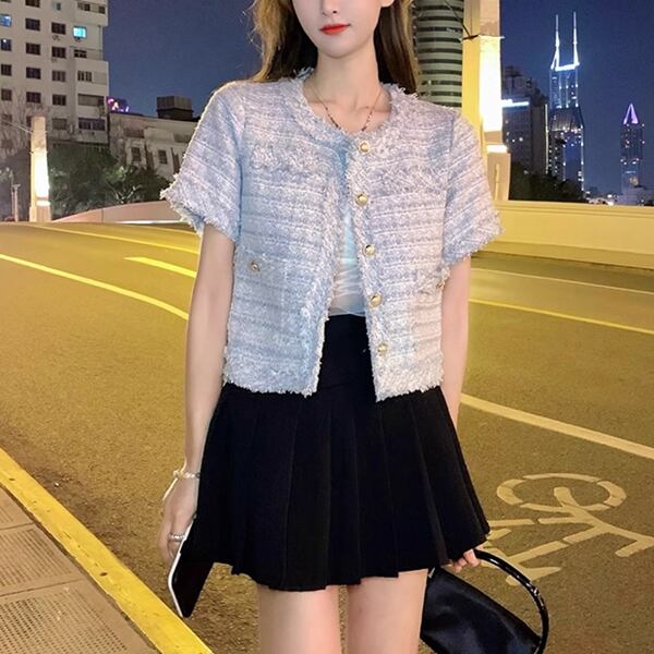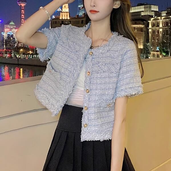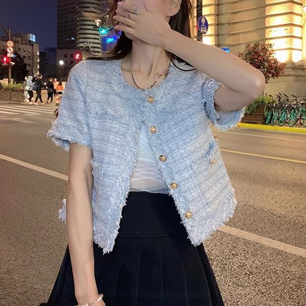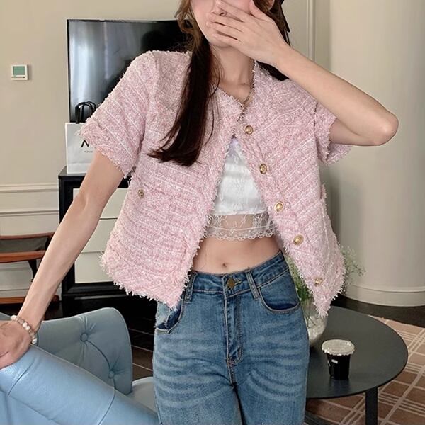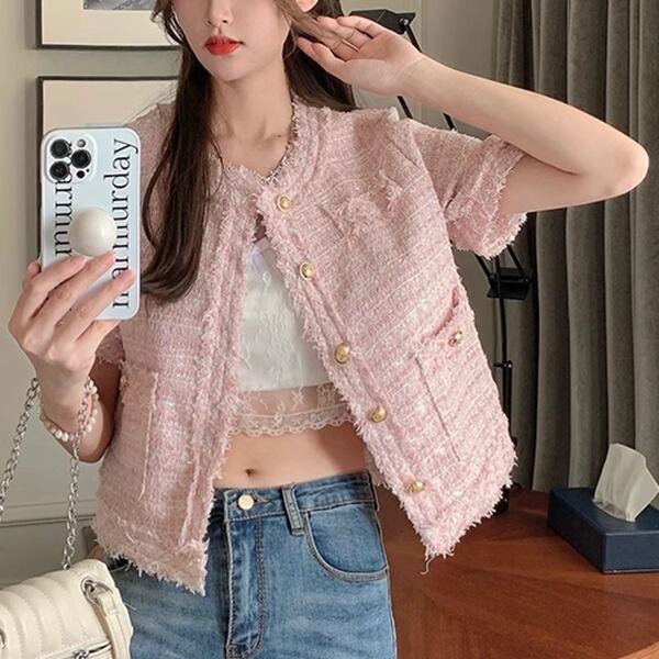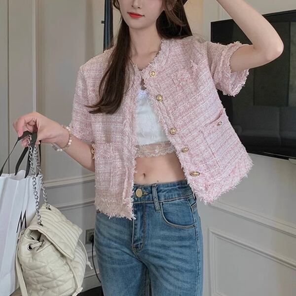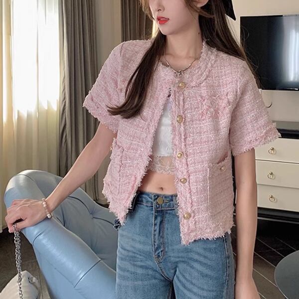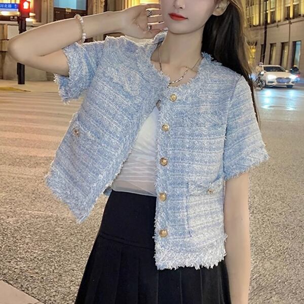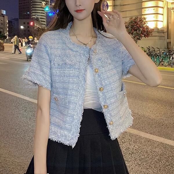 2カラー レディース トップス ジャケット カーディガン アウター 上着 テーラードジャケット ブレザー ショート 半袖 ラウンドネック ストレート フォーマル フェミニン ポケット ツイード ボタン フリンジ 大人可愛い きれいめ 上品 おしゃれ ガーリー ルーズ モード系 エレガント ラブリー セレブリティ 清潔感 爽やか 涼しげ 無地 春 夏 秋 10代 20代 30代 オフィス 通勤 イベント レストラン レイヤード