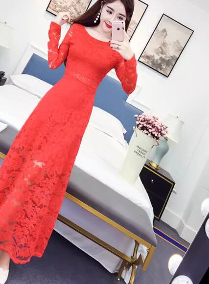 鮮やかな発色と美しいシルエット、上品でエレガントなレースが魅力的なロング丈の長袖レースドレス。