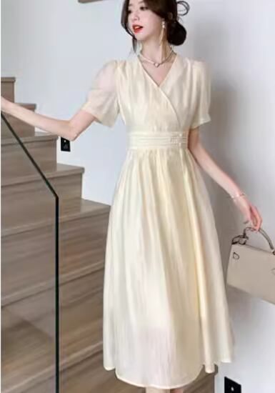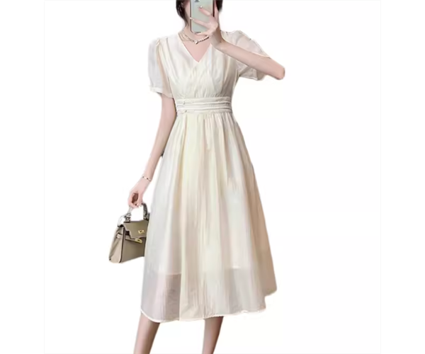 シンプルで洗練されたデザインと美しいシルエットが魅力的な夏用のミモレ丈ドレス。