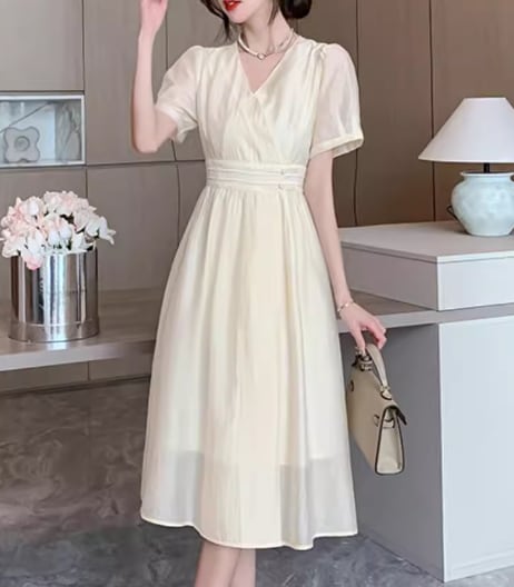 レディース ドレス ワンピース パーティードレス パーティー ミモレ ロング 半袖 パフスリーブ Vネック カシュクール Aライン フリル ウエストマーク プルオーバー 可愛い きれいめ シンプル 大人可愛い 上品 おしゃれ キュート ガーリー エレガント 清楚 シック 高級感 フェミニン 女性らしい 無地 イベント ホテル レストラン デート 食事会 会食 高見え 女子会 夏 S M L XL ホワイト