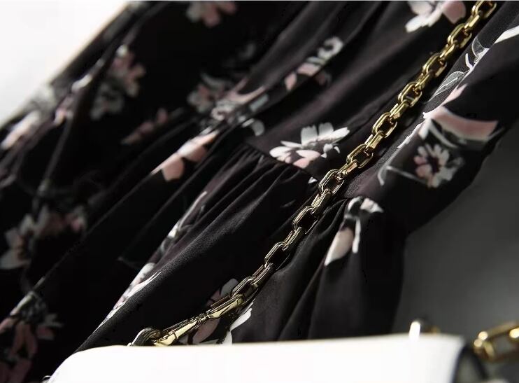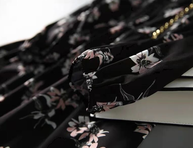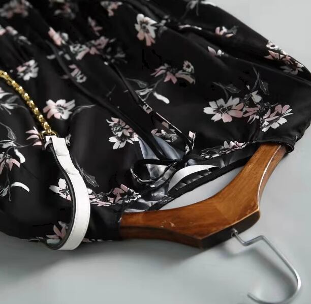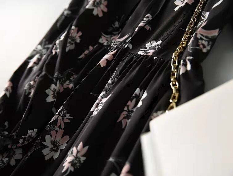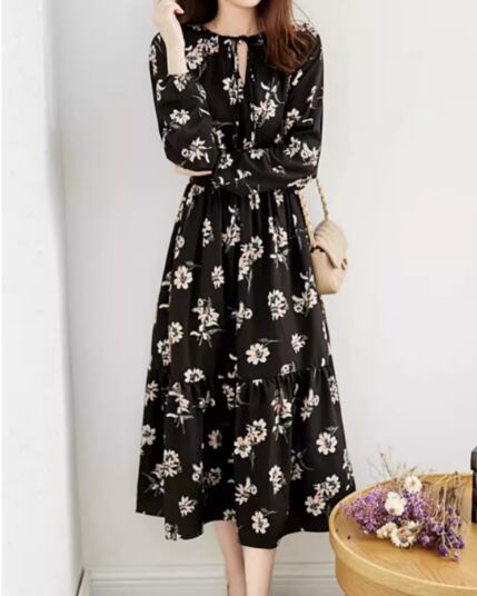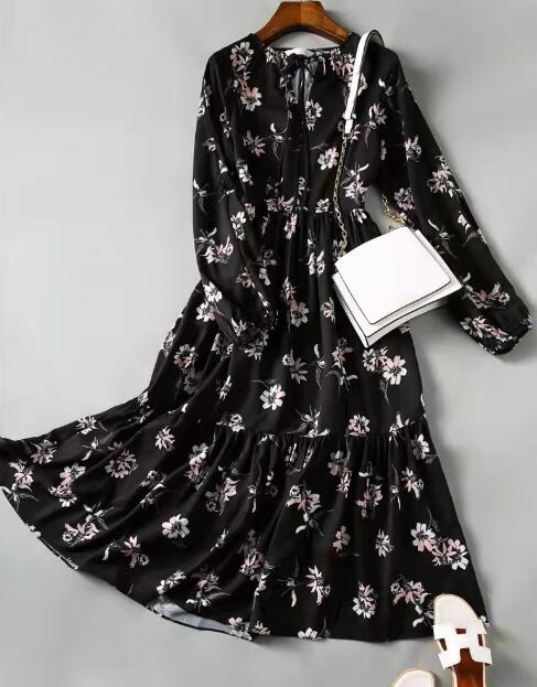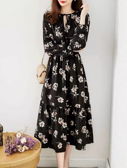 レディース スカート 膝下 ミモレ ロング 長袖 Vネック Aライン ティアード フェミニン シフォン リボン ウエストマーク ハイウエスト 異国風 かわいい 大人可愛い きれいめ 上品 おしゃれ レトロ ガーリー エレガント キュート 知的 シック 高級感 優しい 穏やか 柔らかい 花柄 フラワー プリント 春 秋 デート お出かけ 普段使い モテ 清楚 S M L XL 大きいサイズ ブラック