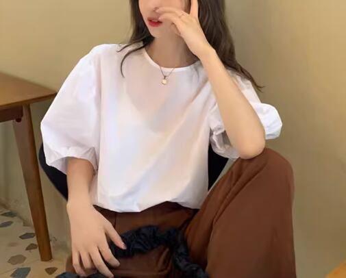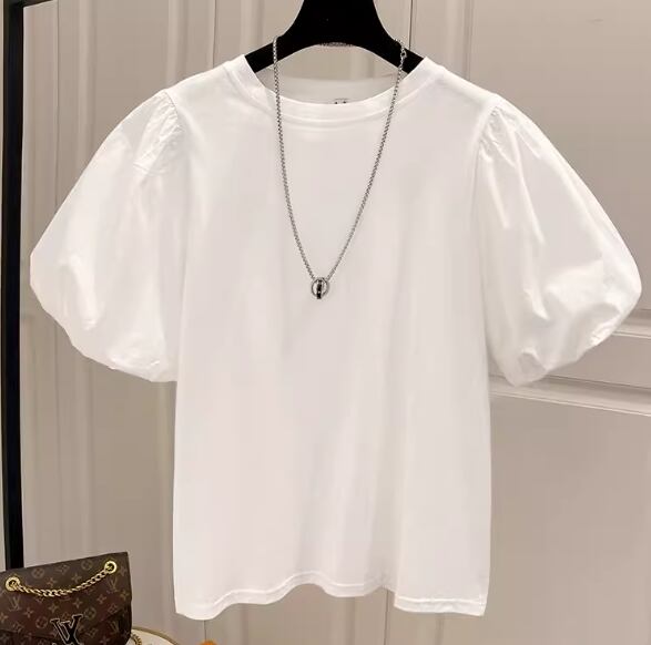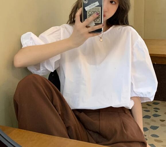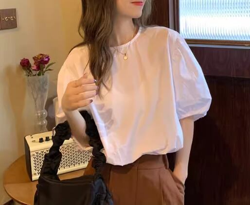 ボリュームのあるパフスリーブがおしゃれな半袖の白Tシャツ。