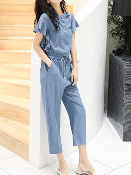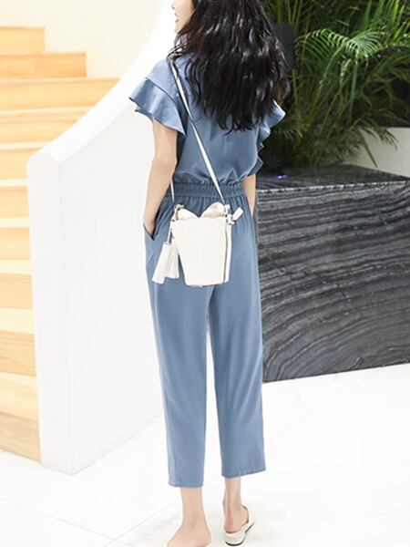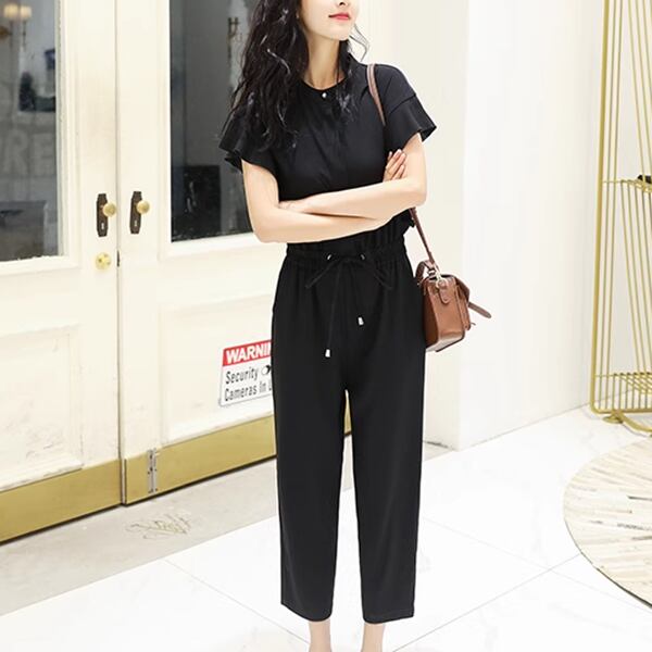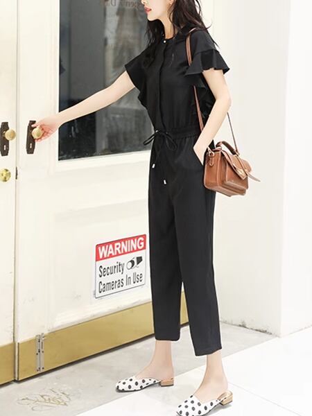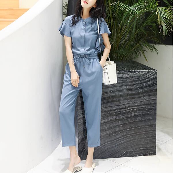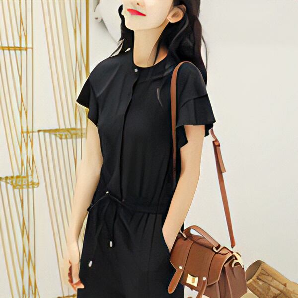 3色展開 レディース オールインワン アウター つなぎ カジュアルスーツ ジャンプスーツ ワークパンツ ワイドパンツ 半袖 フリル袖 ラウンドネック クルーネック セミフレア ストレート テーパード シフォン ウエストマーク ハイウエスト ドロスト ギャザー 薄手 シンプル カジュアル 上品 かっこいい ガーリー ルーズ エレガント モダン オフィスカジュアル スタイリッシュ 無地 20代 30代 オフィス 通勤 パーティー イベント レストラン ホテル